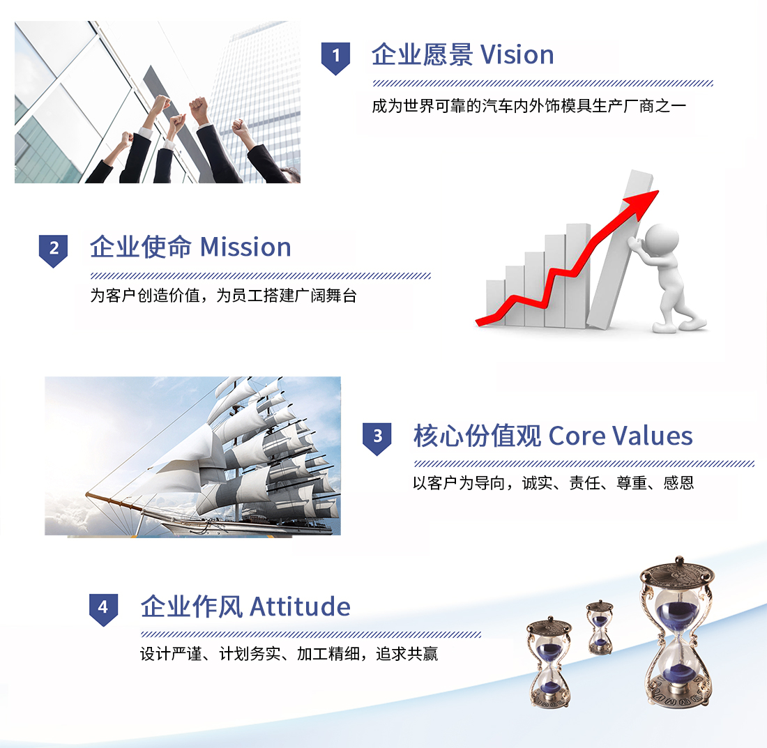 為客戶創(chuàng)造價(jià)值,為員工提供廣闊舞臺(tái),堅(jiān)持綠色環(huán)保創(chuàng)新,成為世界汽車模具企業(yè)之一